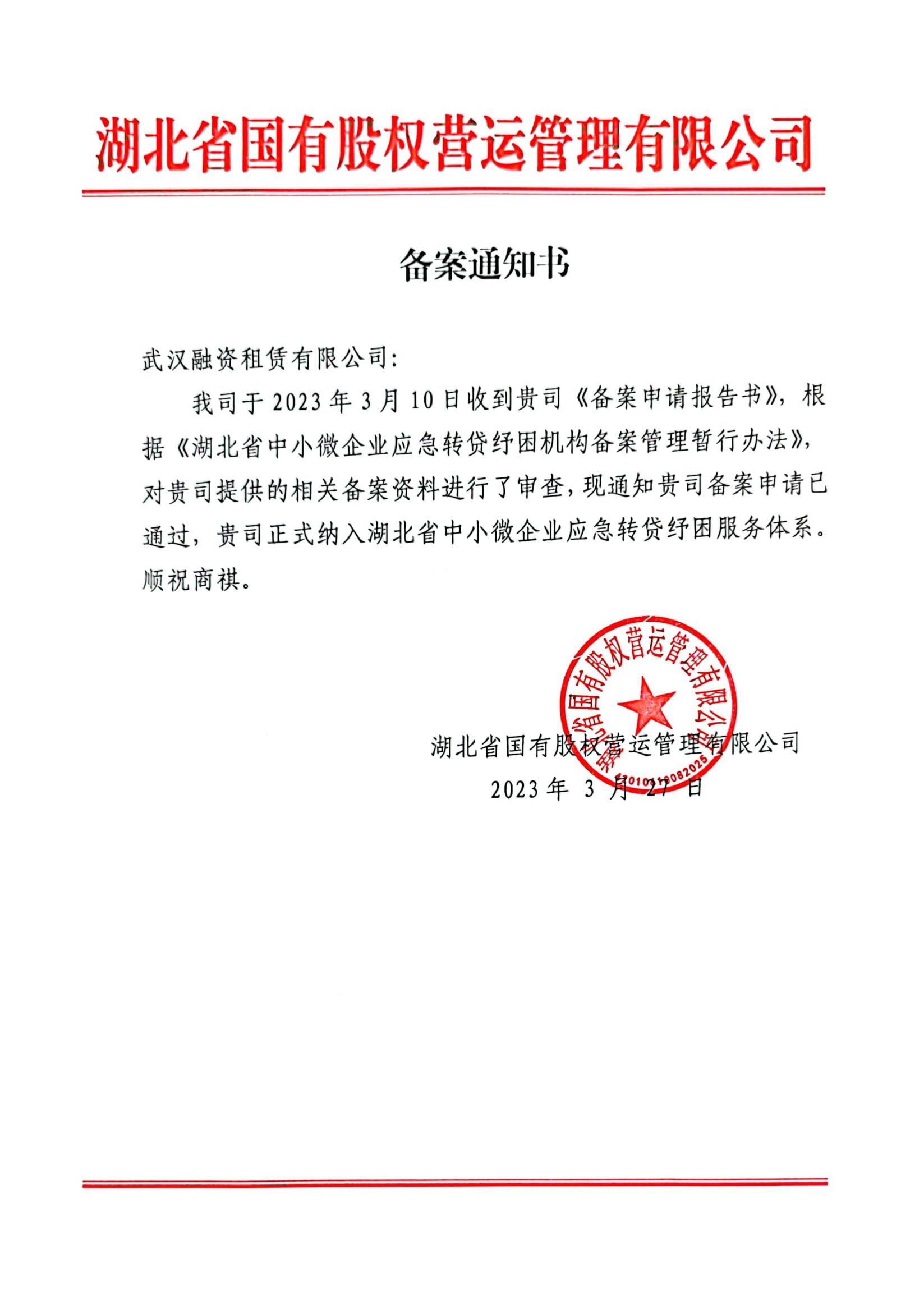 2023年3月27日,武漢融資租賃有限公司通過湖北省國有股權營運管理有限公司備案審查,正式納入省中小微企業應急轉貸紓困服務體系。